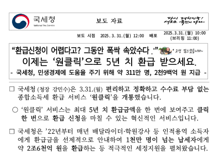 이러한 흐름 속에서 국세청이 제공하는 "원클릭 환급 서비스"는 매우 유용한 도구로 주목받고 있습니다.