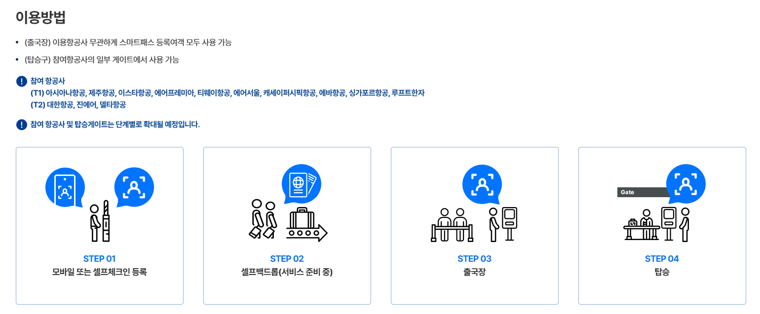 여권과 탑승권 정보를 사전에 등록한 뒤, 얼굴 인식을 통해 출국 절차를 간편하게 처리할 수 있게 해주는 시스템입니다.
