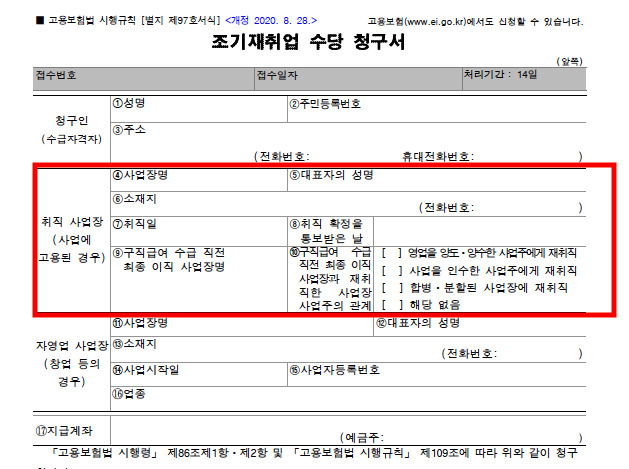 재취업 정보, 사업장 정보, 고용형태 등을 정확하게 입력