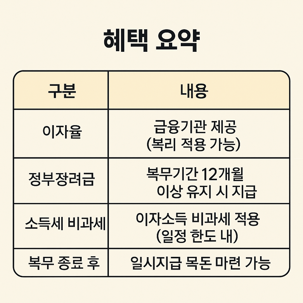 특히 일정 기간 이상 유지 시 보너스 금액이 별도로 제공되며, 복무 중 중도 해지 시 일부 혜택이 축소될 수 있으므로 가급적 만기까지 유지하는 것이 유리합니다.