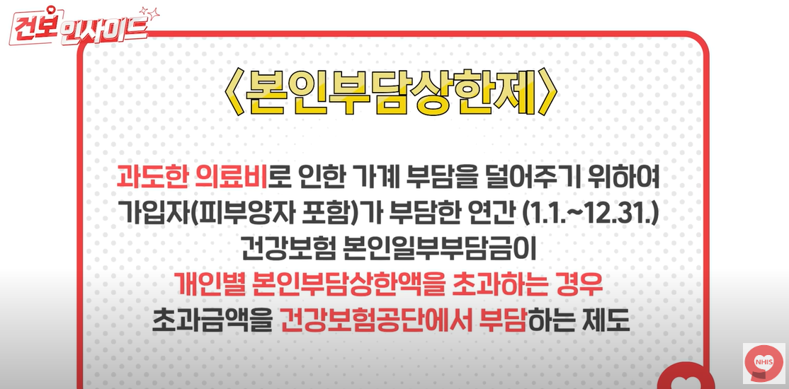 가장 대표적인 제도가 ‘본인부담상한제’입니다. 연간 건강보험 가입자의 의료비 본인부담금이 일정 금액을 초과하는 경우, 초과한 금액을 국민건강보험공단에서 환급해주는 제도입니다.