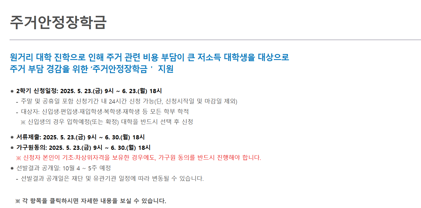 오늘은 2025년 기준으로 주거안정장학금의 신청 자격, 기간, 금액, 절차 등 전반적인 내용을 자세히 알아보겠습니다.