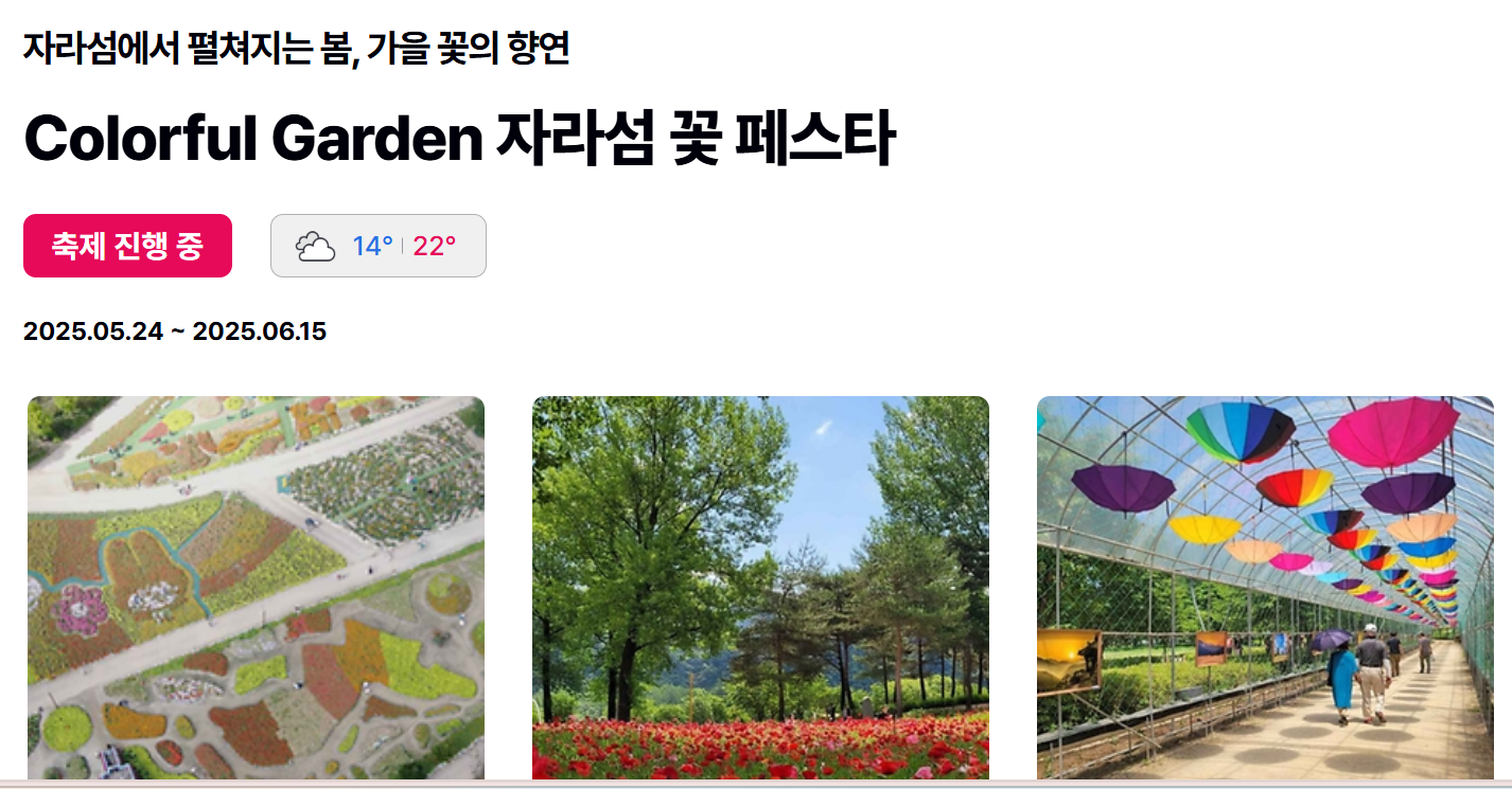 2025년 자라섬 꽃축제는 아름다운 꽃들과 함께 다양한 프로그램이 준비되어 있어, 가족, 친구, 연인과 함께 즐기기에 좋은 행사입니다.