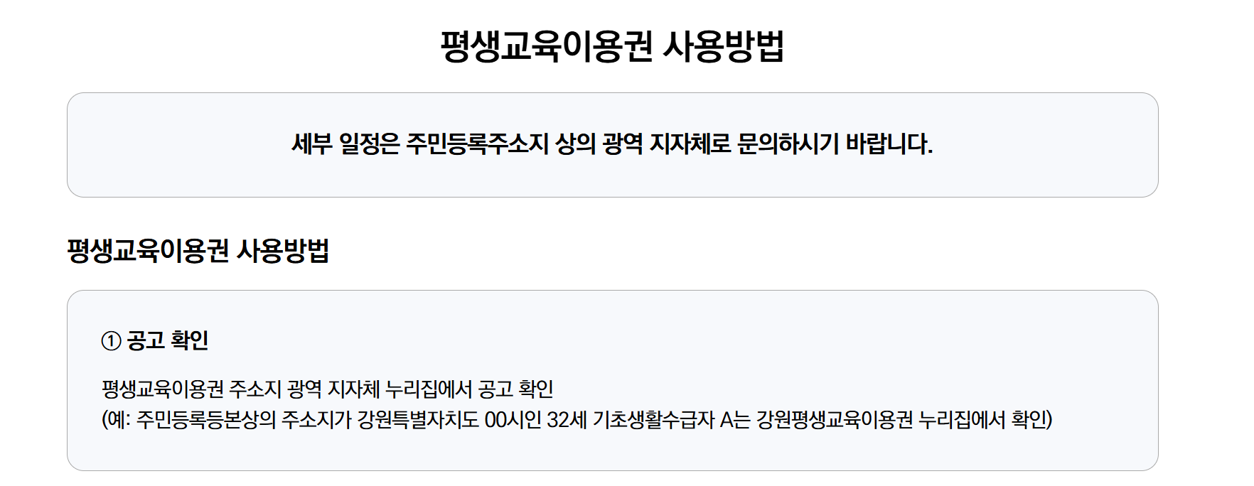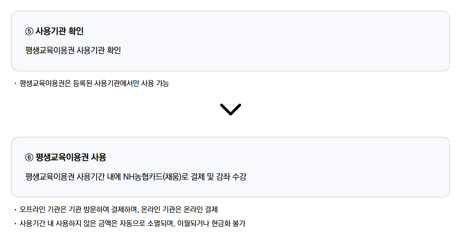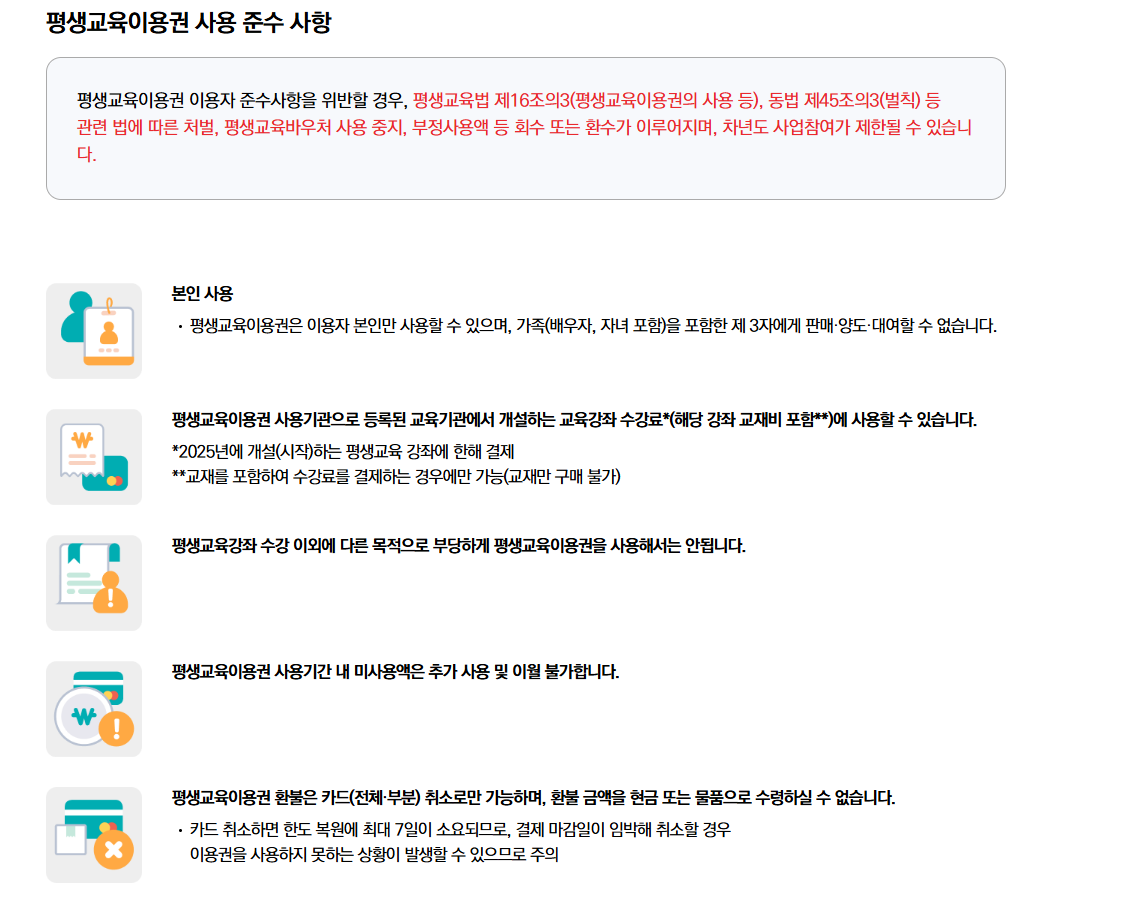 예를 들어, 2025년 5월에 발급받았다면 2026년 4월 말까지 바우처를 사용할 수 있습니다. 기간이 지난 뒤에는 사용할 수 없으므로, 관심 있는 강좌를 미리 조사하고 계획적으로 활용하는 것이 중요합니다.