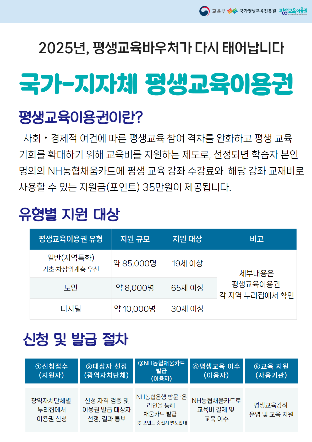 2025년 ‘평생교육이용권’ 사업이 본격적으로 시행됩니다. 이 제도는 교육비 부담으로 인해 학습의 기회를 놓치고 있는 많은 성인 학습자들에게 다시 한번 배움의 기회를 제공하고자 마련된 제도입니다.