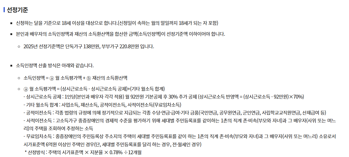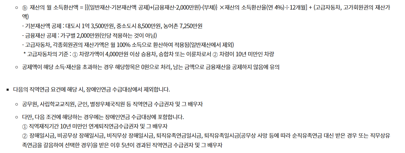 ▲ 지원대상· 18세 이상의 「장애인연금법」상 중증장애인(종전 1~3급 중복) 중 본인과 배우자의 월 소득인정액(소득과 재산 합산액)이 선정기준액* 이하인 자 * 2025년 선정기 - 정책브리핑 | 뉴스