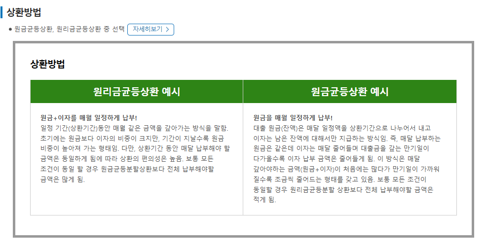 상환 방법은 두 가지 방식 중 하나를 선택할 수 있습니다.
