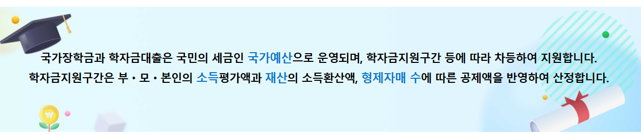 국가장학금은 학생 본인 또는 가정의 소득 상황을 고려하여, 학자금 지원 구간별로 등록금의 일부를 국가가 대신 부담해 주는 제도입니다.