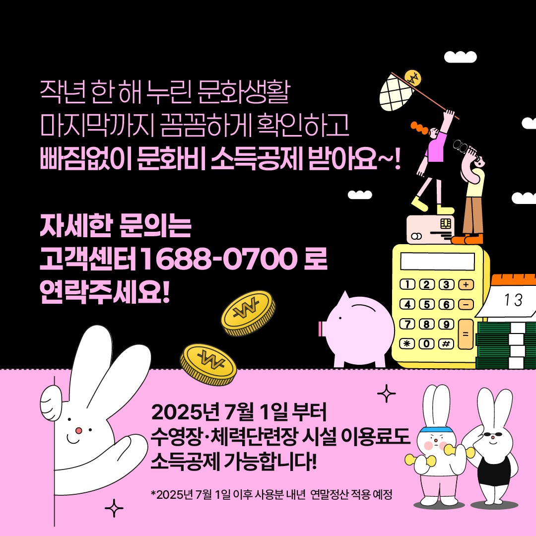 마지막으로, 문화비 소득공제 관련 문의가 필요할 경우에는 문화비 소득공제 고객센터(1688-0700) 또는 문화체육관광부 체육정책국 스포츠산업과(044-203-3157)로 연락하면 보다 자세한 안내를 받을 수 있습니다.
