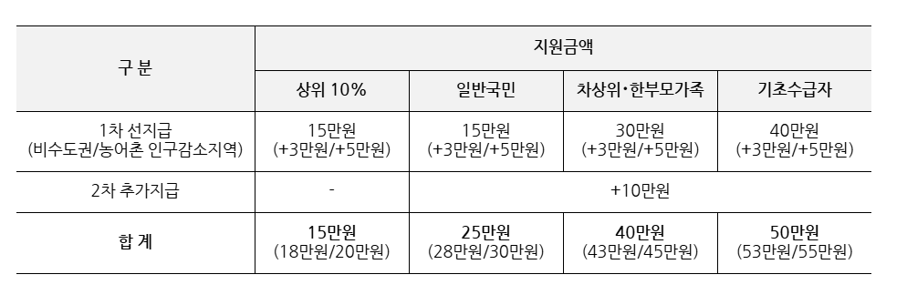 단, 특히 비수도권 및 인구감소지역 거주 주민들에게는 3만 원의 추가 지원금이 별도로 지급됩니다.