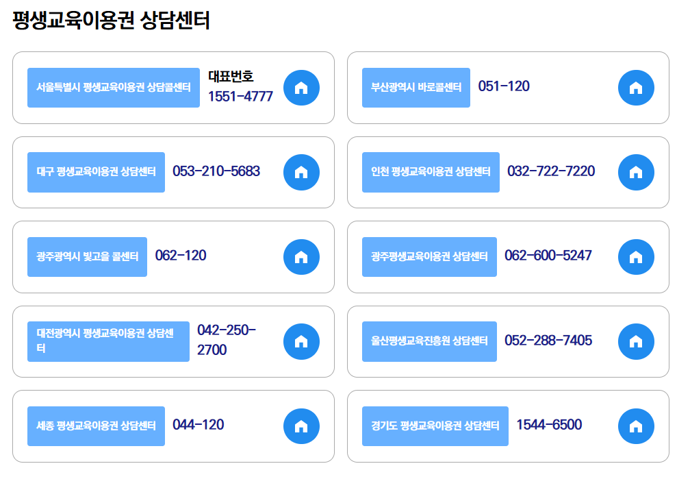 평생교육이용권 상담센터 서울특별시 평생교육이용권 상담콜센터 대표번호 1551-4777 부산광역시 바로콜센터 051-120 대구 평생교육이용권 상담센터 053-210-5683 인천 평생교육이용권 상담센터 032-722