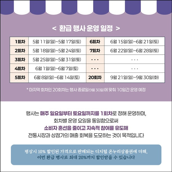 매주 1만 원 이상 소비로 환급을 받고, 최대 40만 원까지 혜택을 누리세요. 전통시장과 가맹점을 방문해 따뜻한 지역경제를 함께 만들어가는 소비를 실천해보시는 건 어떨까요?