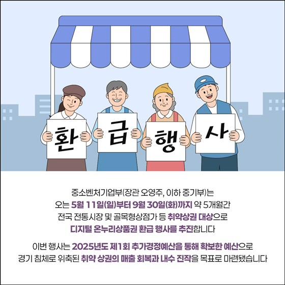 소비자는 할인된 가격에 상품권을 구매해 알뜰하게 사용할 수 있고, 전통시장과 골목상권 소상공인들은 더 많은 고객 유입 효과를 누릴 수 있습니다.