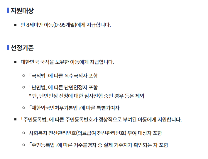 신청대상은 2025년에도 변함없이 국내 거주 중인 만 8세 미만 아동입니다.