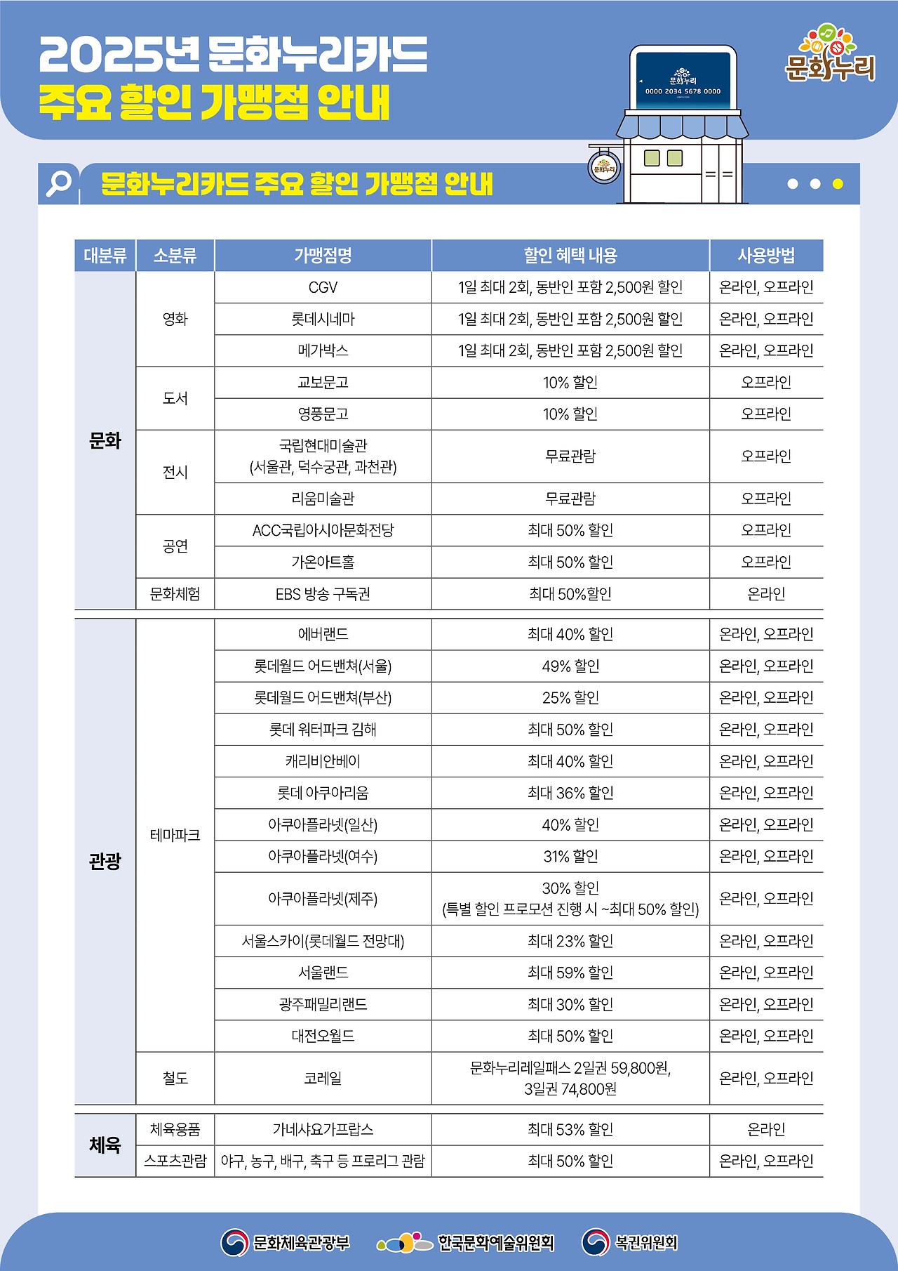 예를 들어, 문화 영역에서는 CGV, 롯데시네마, 메가박스 등 주요 영화관, 교보문고, YES24 등 대형서점, 뮤지컬, 연극 공연 예매처에서 사용할 수 있습니다.