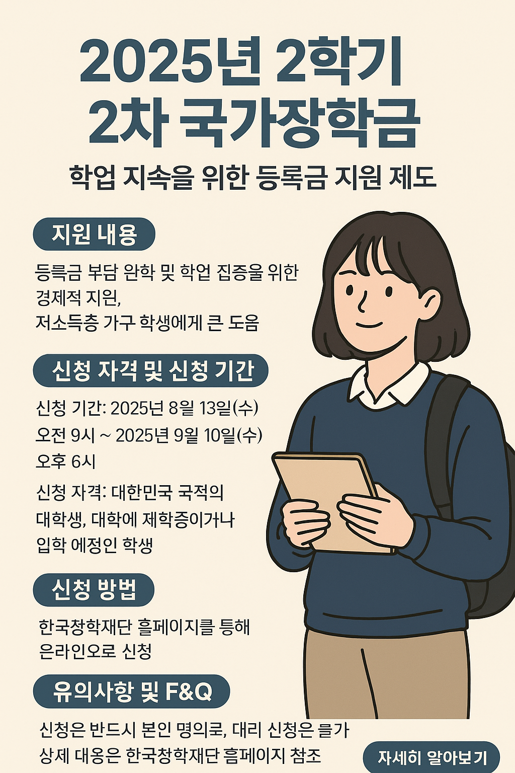 현재 2025년 2학기 2차 국가장학금 신청 기간이 진행 중입니다. 이번 글에서는 국가장학금의 지원 내용, 신청 자격, 신청 기간 및 방법, 그리고 자주 묻는 질문과 유의사항 등을 상세히 알아보겠습니다. 장학금 혜택을 놓치지 않도록 꼼꼼히 확인해 보세요!
