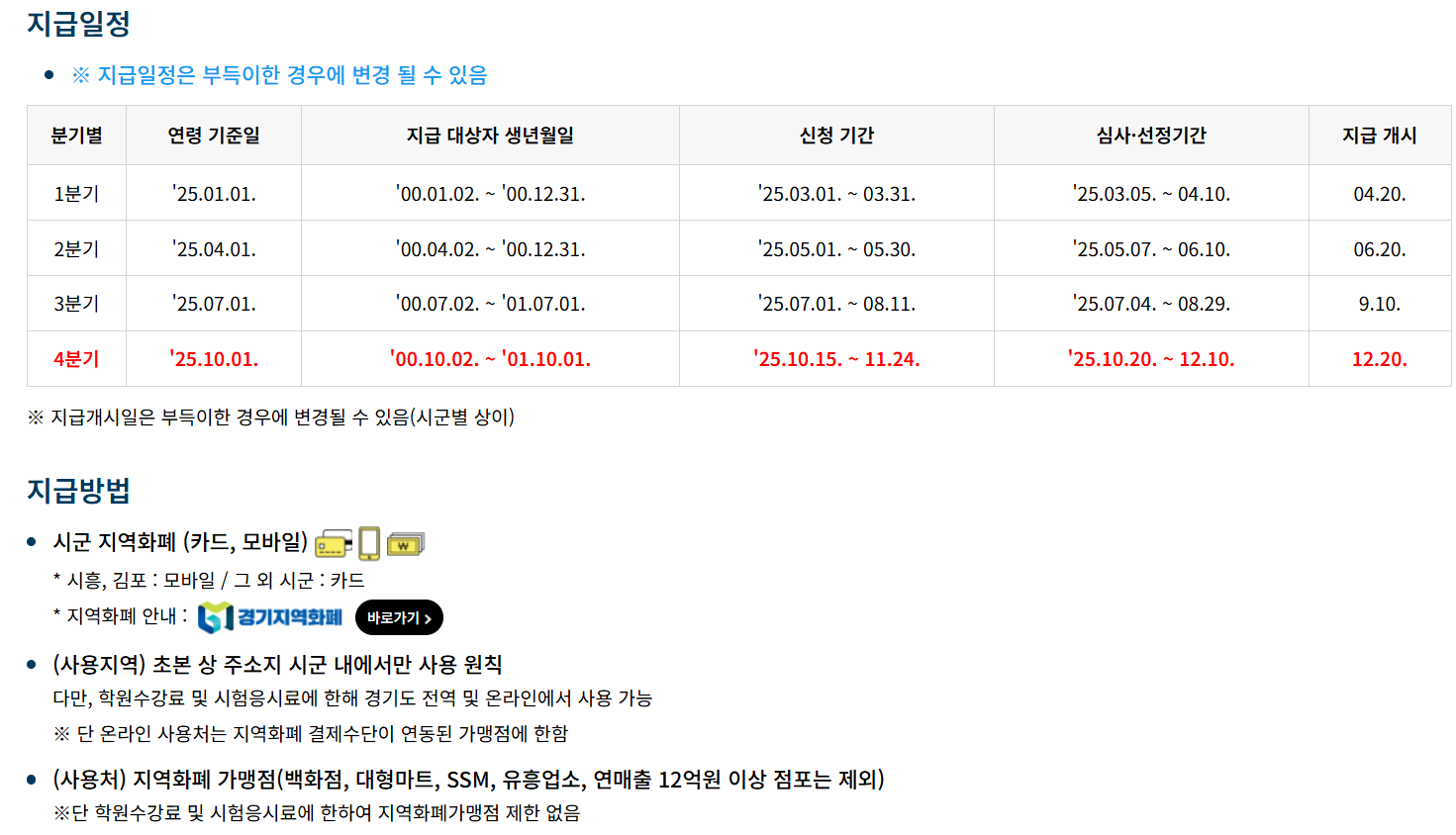 지급 방식은 주소지 시군 내 ‘지역화폐’ 형태로 지급되며, 카드형·모바일형·지류형 등이 될 수 있습니다.