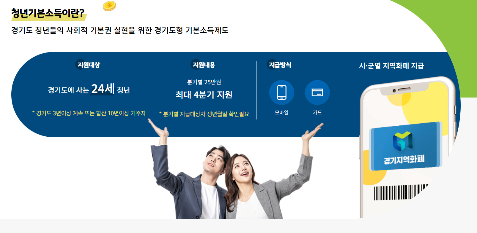 ‘청년의 사회적 기본권 보장’이라는 취지로, 경기도 내 만 24세 청년에게 지역화폐 형태로 지급되는 지원금이 본 제도의 핵심입니다.