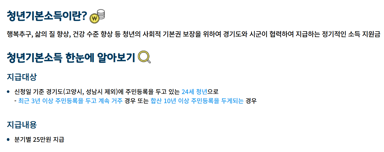 경기도에 거주하는 만 24세 청년이라면 (성남·고양시 제외) 3년 연속 또는 합산 10년 이상 거주 요건을 충족할 경우, 분기 25만 원(연 최대 100만 원)을 지역화폐로 지원받을 수 있는 제도입니다. 신청기간과 사용처를 꼼꼼히 확인하는 것이 핵심입니다.