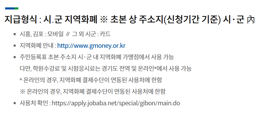 신청 조건 충족 후 선정되면, 주소지 시군에서 지급하는 지역화폐(카드·모바일 등) 형태로 지급됩니다. 지급된 화폐는 해당 시군 내 가맹점에서 사용 가능하며, 일부 시군은 모바일형만 등록된 경우도 있습니다.