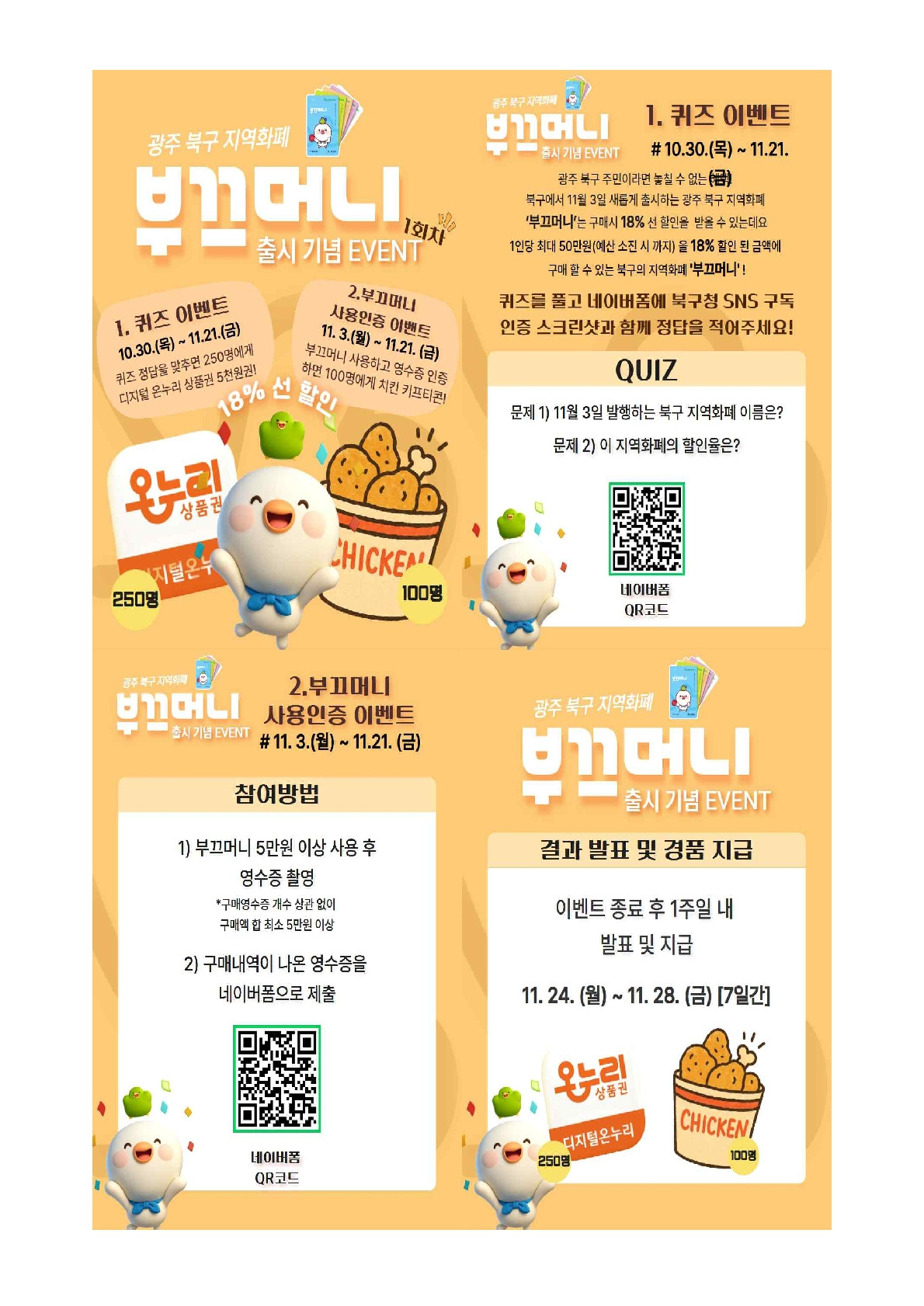 부끄머니는 북구의 상징 캐릭터 ‘부끄’와 화폐 ‘머니(Money)’를 결합한 이름으로, 지역 주민들이 일상 속에서 자연스럽게 북구 내 소비를 늘리도록 유도하는 것이 핵심 목적입니다.