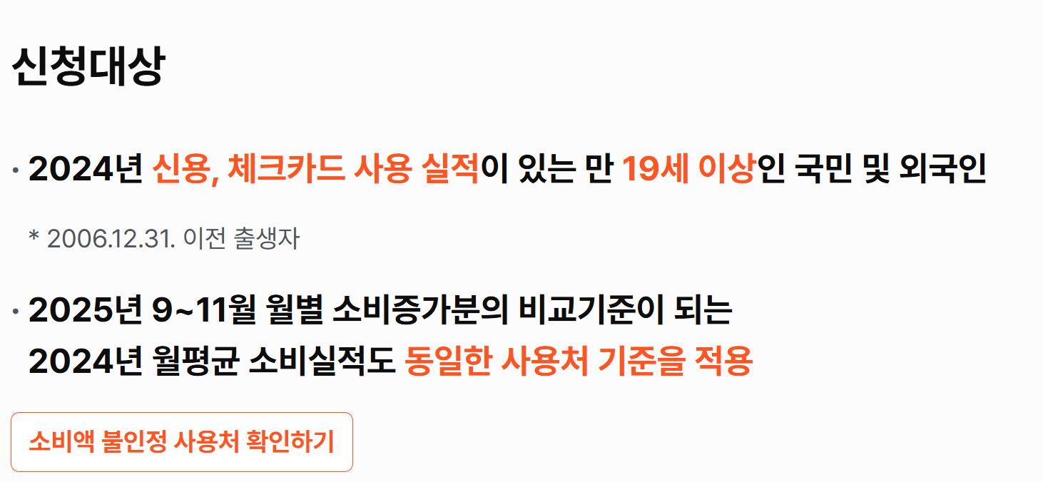 A. 신용카드 또는 체크카드. 단, 법인카드, 선불카드, 기프트카드 등은 제외됩니다. 과거 2024년에 실적이 있어야 신청 대상입니다.