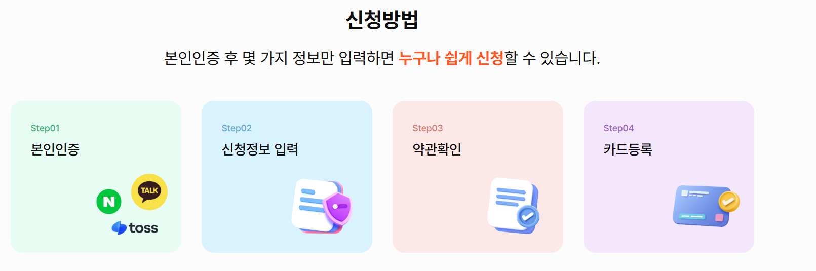 온라인: 공식 홈페이지를 통해 본인 인증 → 카드 등록 → 신청 완료