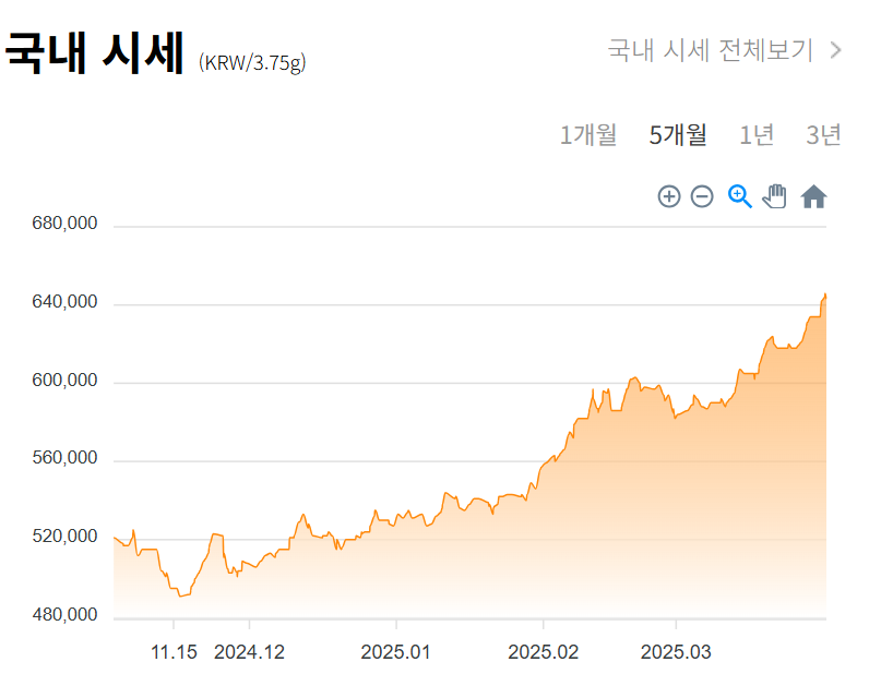 한국금은: 순금 1돈(3.75g) 구매 시 622,000원, 판매 시 525,000원.