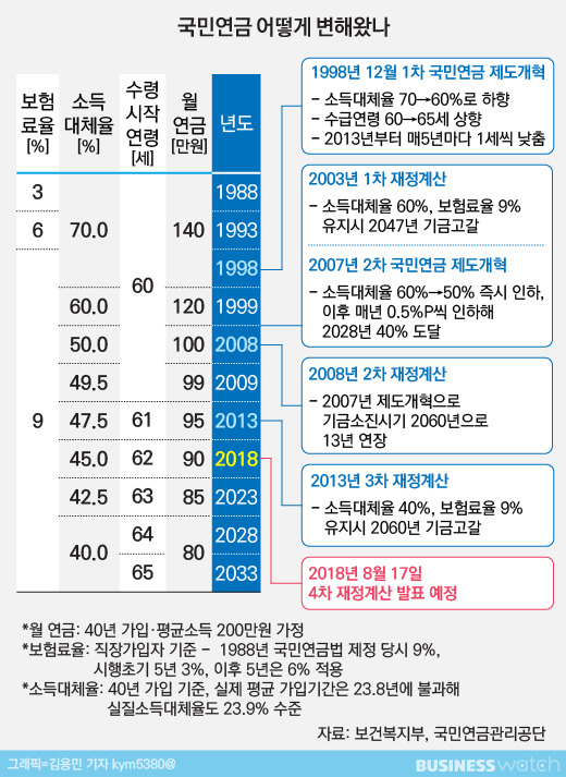 이 이미지는 국민연금 제도의 변천사를 보여주며, 각 개혁의 주요 내용을 정리하고 있습니다.