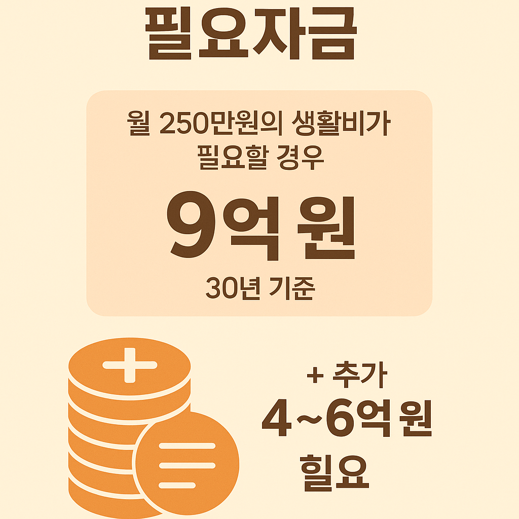 예를 들어, 월 250만원의 생활비가 필요하다고 가정하면, 30년 기준 약 9억원의 자금이 필요합니다.