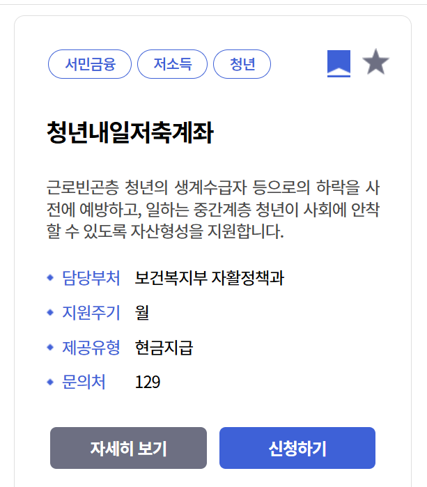 *청년 내일저축계좌 자세히 보기: https://www.bokjiro.go.kr/ssis-tbu/twoaa/aplySrvChc/selectServChs.do?wlfareInfoId=WLF00000060&wlfareInfoReldBztpCd=undefined