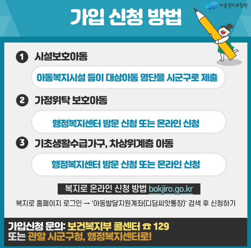 해당 아동이 보호받고 있는 복지시설, 가정위탁기관 또는 거주지 관할 주민센터(동사무소)에서 신청할 수 있습니다.