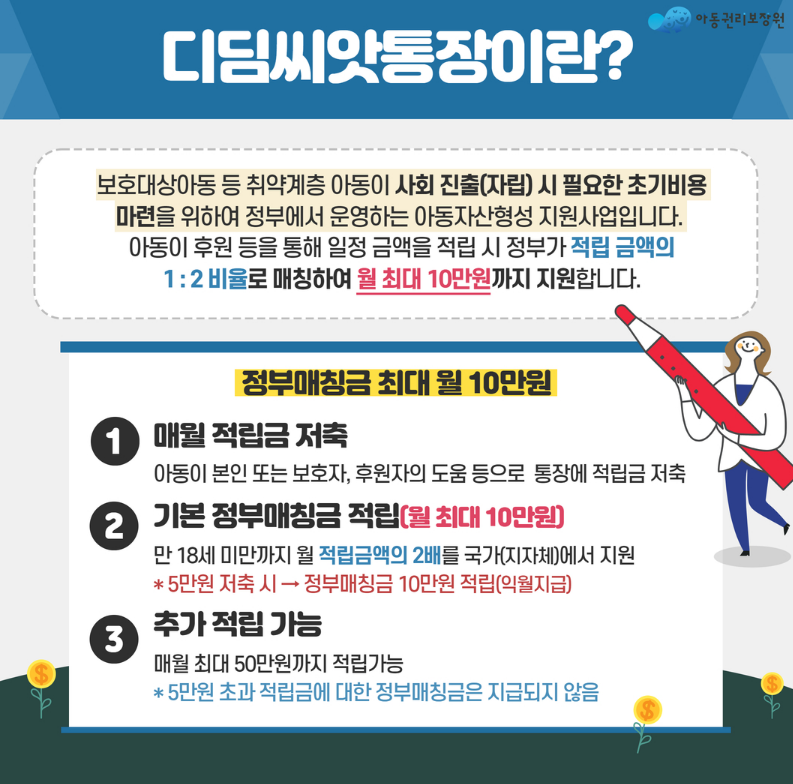 디딤씨앗통장은 단순한 저축 상품이 아니라, 국가와 민간이 협력하여 아동의 미래를 함께 설계하는 따뜻한 제도입니다.